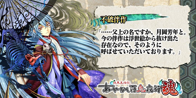 公式 あやかし百鬼夜行 魂 در توییتر キャラ紹介 不破伴作 豊臣秀次に仕えた小姓 戦国三大美少年の一人として名を残している あやかし百鬼夜行では 月岡芳年の描いた浮世絵を元に 怪異の正体を見抜く勇士として登場 あやかし百鬼夜行 あや魂