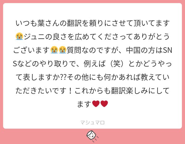 葉 V Twitter いつもありがとうございます 面白い質問ですね 普段なら 哈哈 発音 はは を使いますが 絵文字系ならxd や それとネット用語の 233 マシュマロを投げ合